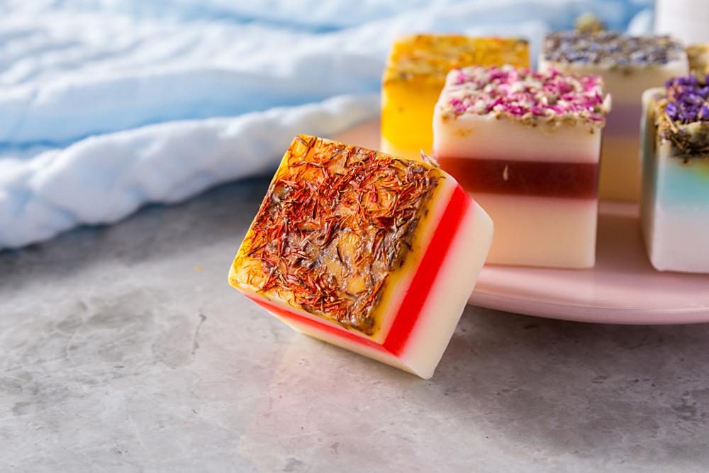 - handmade soap + plastic thin film + packaging box + middle box + carton box